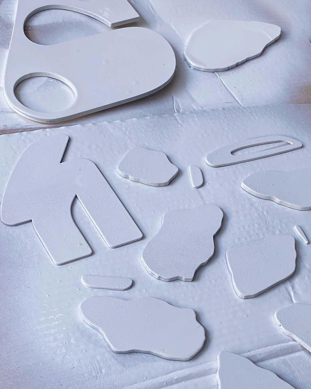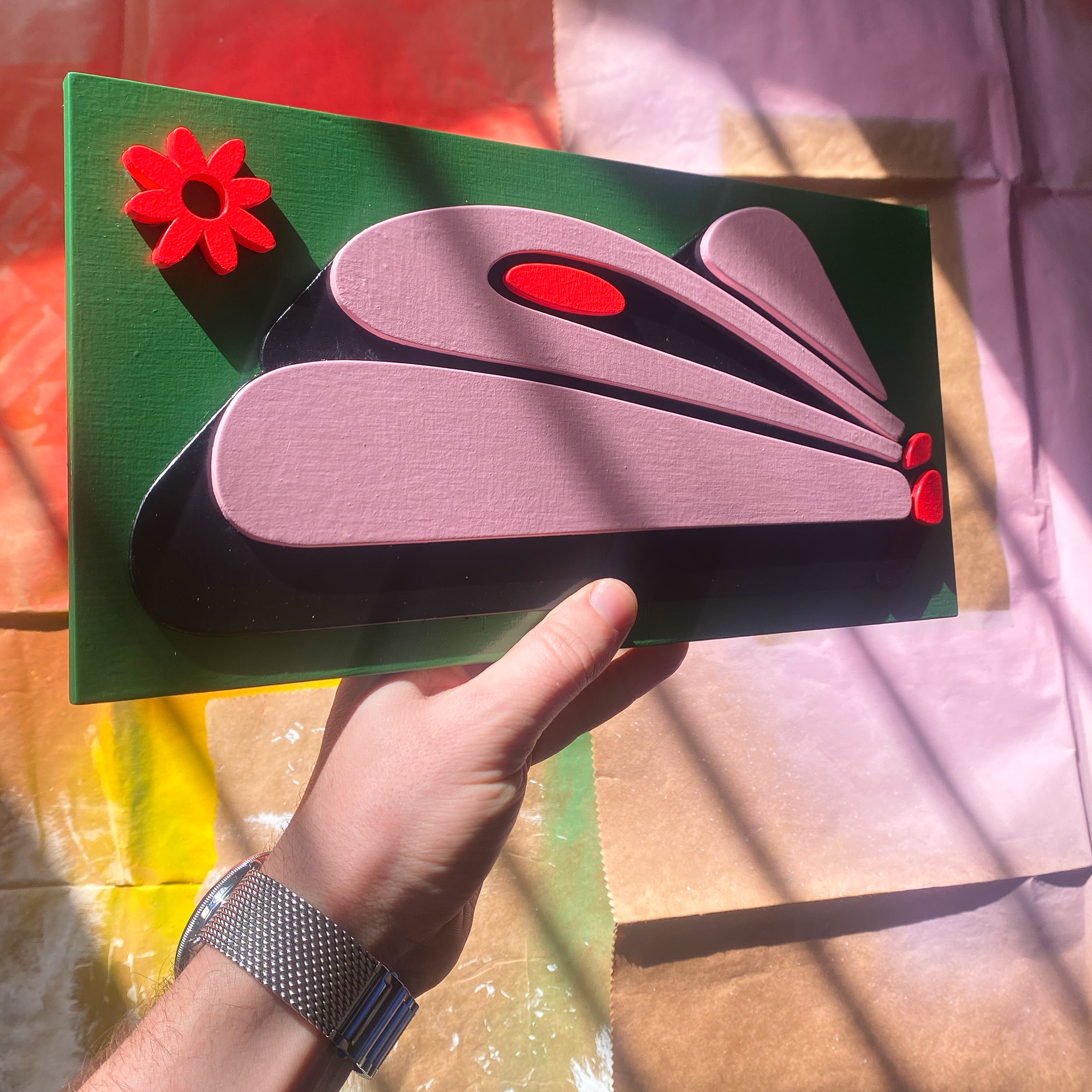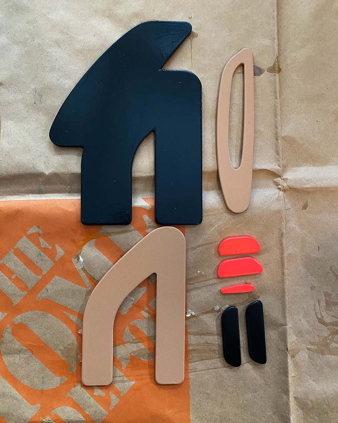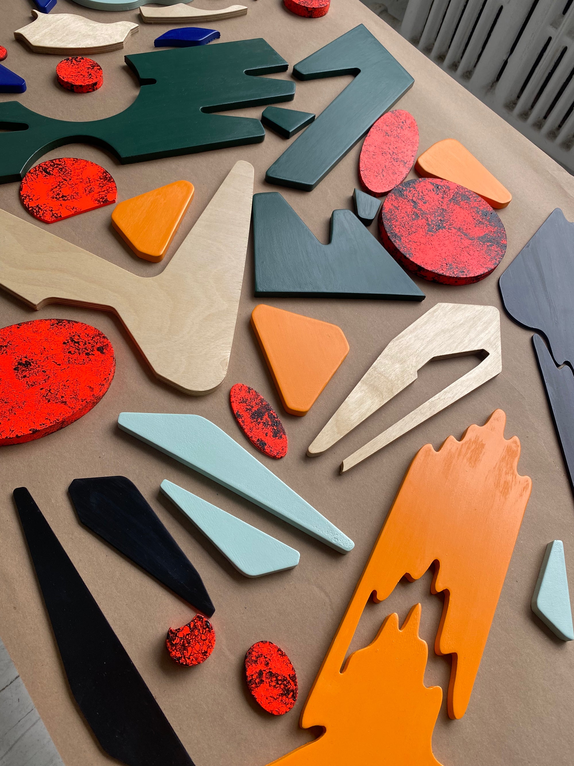 and juxtapositions. Figures that are inspired by motion, but are rendered in solid, unmoving materials. Shapes that feel informed by precise geometry, as well as organic spontaneity. Finding the fine line between abstraction and representation. Paintings that feel like sculptures, or sculptures that feel like paintings. Characters that feel like objects, and objects that feel animated with personality.